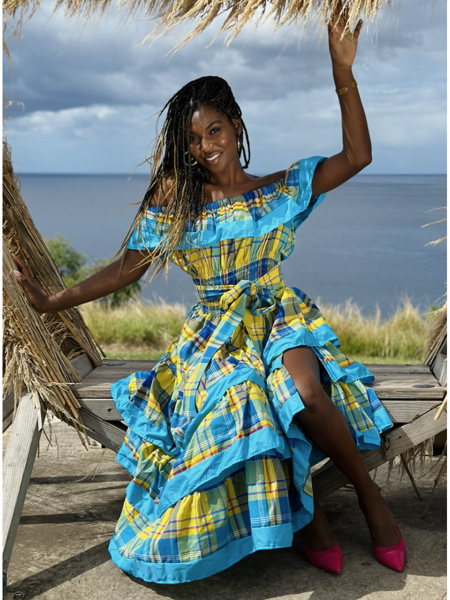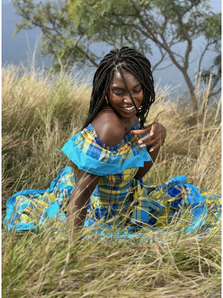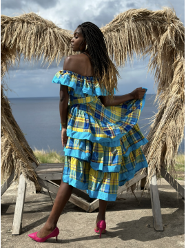 Elégant, ce beau modèle créole est réalisé entièrement en Madras avec des bandes en Coton. Buste en smocks, col en V l'ouverture de devant ornée de volants. Une ceinture à nouer vient marquer la forme de la taille.