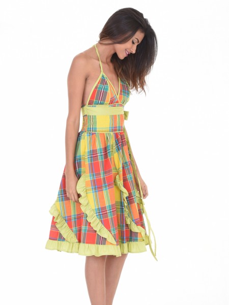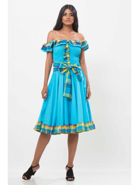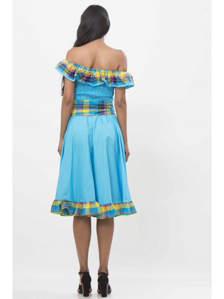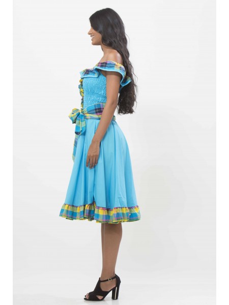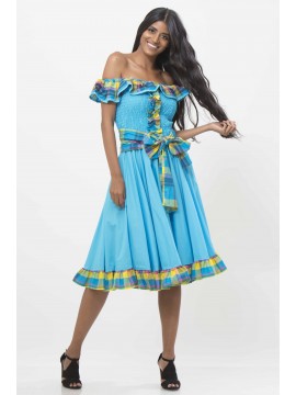 Robe créole avec dos accord en coton-madras, longueur genou, col en bateau avec un élastique , ceinture à la taille, manches trois-quarts finalisées par des volants en cloches.