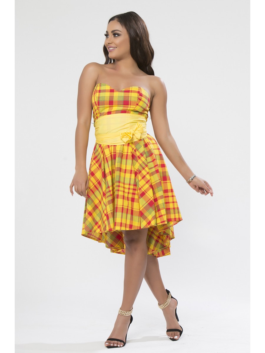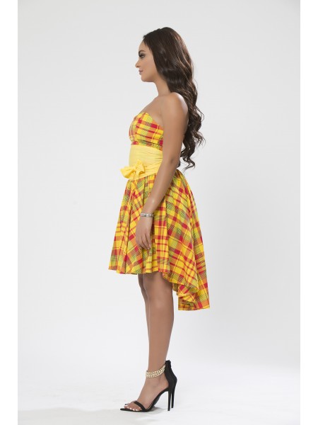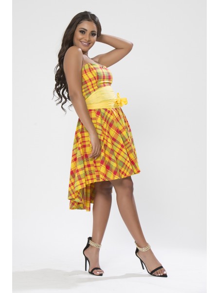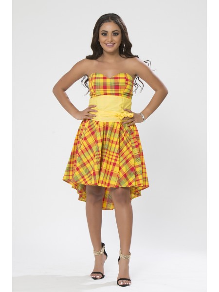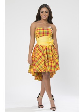 La robe Camelle entièrement en madras aux couleurs très vives est ce que vous en avez besoin pour compléter votre garde-robe. Cette robe du style antillais est légère, élégante et d’une coupe spéciale courte de devant longue de derrière est parfaite si vous souhaitez être à la fois sexy et chic. L'originalité de la robe réside surtout dans le bustier décolleté aux épaules dénudées, sa coupe ceintrée au niveau de la taille par une ceinture et la jupe légèrement évasée permet de faire étalage à votre figure tout en restant confortable. Selon les accessoires assortis avec la robe, elle peut être portée de jour comme de nuit.