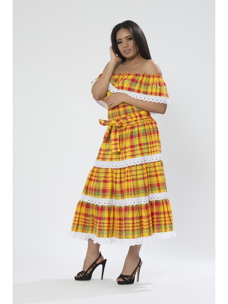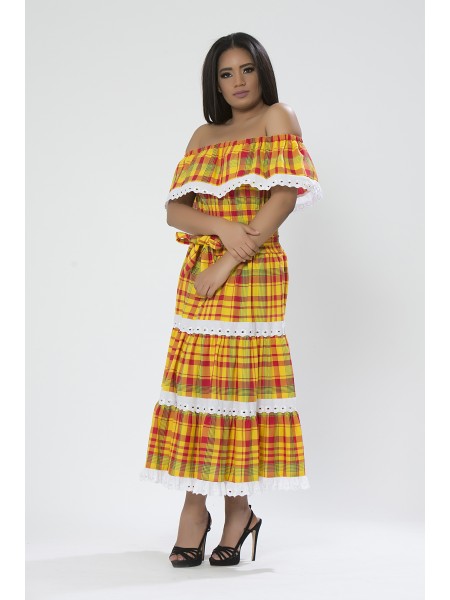 Robe longue du style antillais entre-deux broderie anglaise et madras tout au long, col en bateau à large volant, buste en smocks et évasée depuis la taille.
