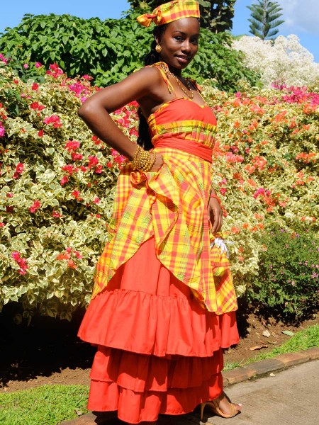 A fois classe et élégante, c'est le moins que l'on puisse dire de cette magnifique robe créole. Col en bateau et manches amples, tous ornés de madras, ouverture de devant et ceinture à nouer au niveau de la taille.
