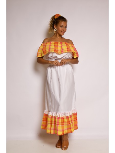 Le style traditionnel antillais est bien remarquable dans la robe Charbely destinée à vêtir la jeune fille des îles, toujours de l'agréable collection de Dody. Très élégant ce beau modèle créole longue est réalisé entre madras et coton. Son col à volant est agrémenté et de différents coloris, laissant paraître la grâce des épaules. Pour finaliser votre tenue, Dody vous propose d'aller dans accessoires vendus séparément.