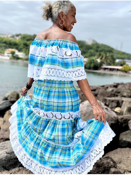 Ensemble créole. Corsage ample, col en bateau et manches trois-quarts finalisés par un large volant souligné d’un ruban de satin. Jupe longue en madras et une ceinture nouée au niveau de la taille en smocks