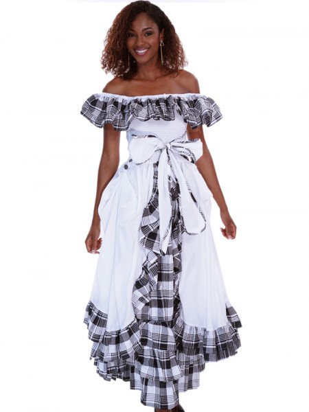 Robe en madras avec des manches trois-quarts. Originale par sa coupe courte en avant et longue du derriere, col en bateau et une ceinture nouee a la taille.