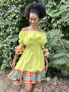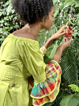 Le style traditionnel antillais est bien remarquable dans la robe Jeunesse II destinée à vêtir la jeune fille des îles, toujours de l'agréable collection de Dody. Très élégant ce beau modèle créole est réalisé en coton avec un légère pointe de madras. Son col en bateau est agrémenté en deux volants en fronces et de différents coloris, laissant paraître la grâce des épaules.