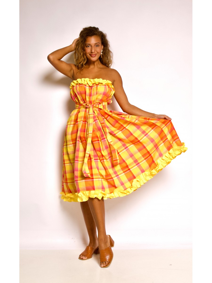 La fusion de mode et de confort dans la robe creole Laeticia de Dody ... En bustier charmant la nudité des épaules, évasée, ajustée à la taille par des smocks sur le dos et une ceinture faintaisiste nouée au-dessous de la poitrine. Réalisée en madras avec des froufrous en coton sur le haut et le bas.Pour finaliser votre tenue, Dody vous propose d'aller dans accessoires vendus séparément