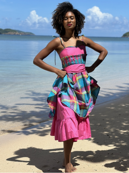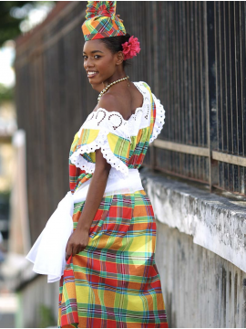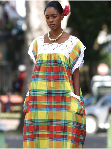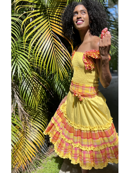 Entièrement en madras, la robe Orange est un des modèles Traditionnel, donnera avec sa coupe évasé, une allure particulière toujours recherchée par l’élégante femme des îles. Buste avec une bande en broderie anglaise ; le haut elle joue la carte de la vraie représentation des caraïbes françaises.