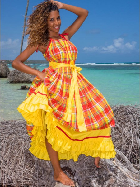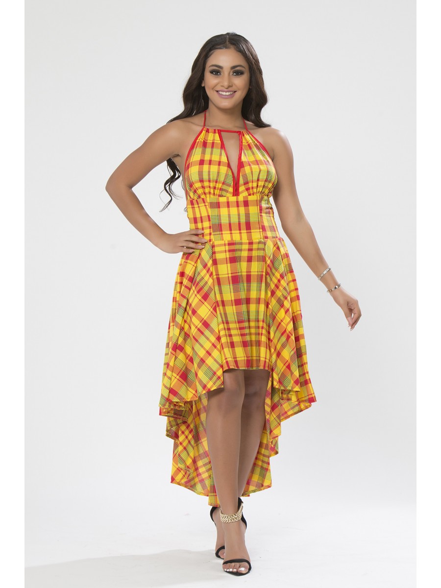Robe en madras créole du style antillais. Coupe courte du devant et longue du derriere
