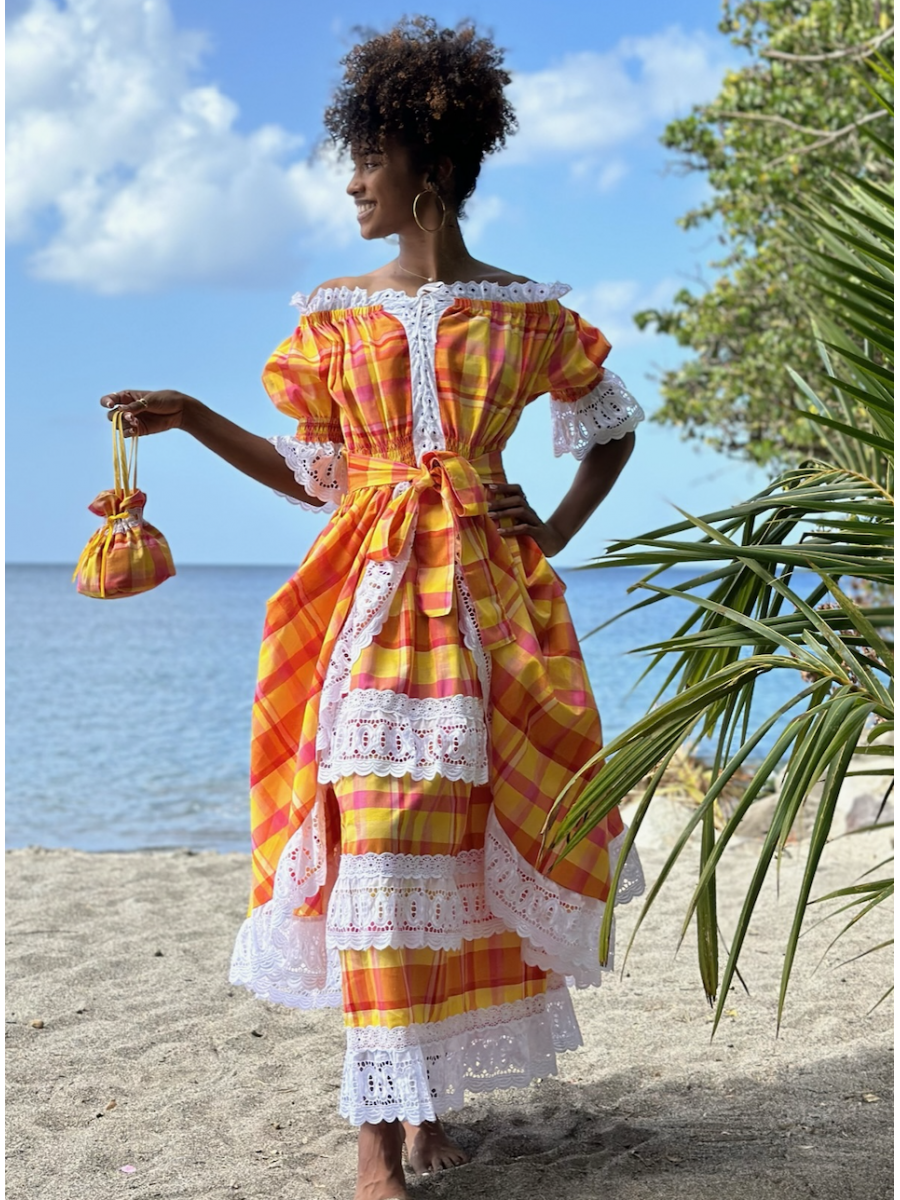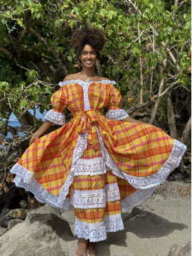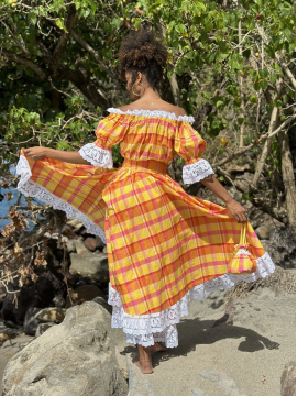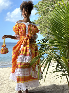 Le style traditionnel antillais est bien remarquable dans la robe Tropique au Madras de la marque DODY destinée à vêtir la jeune fille des îles, toujours de l'agréable collection de Dody. Très élégant ce beau modèle créole est réalisé en madras. Son col en bateau est agrémenté en deux volants en fronces et de différents coloris, laissant paraître la grâce des épaules.