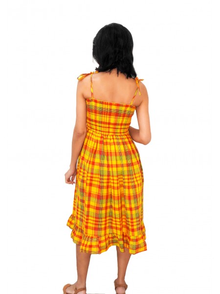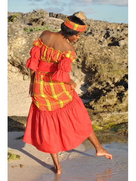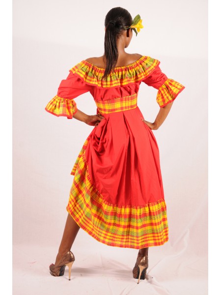 Robe longue du style antillais entre-deux broderie anglaise et madras tout au long, col en bateau à large volant, buste en smocks et évasée depuis la taille.