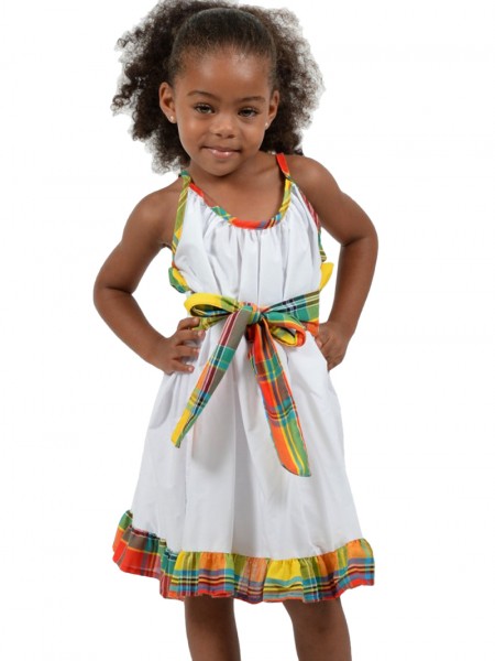 Le style traditionnel antillais est bien remarquable dans la robe Rosa destinée à vêtir la jeune fille des îles, vendu avec son jupon toujours de l'agréable collection de Dody. Très élégant ce beau modèle créole est réalisé en double texture : madras et coton de couleurs assorties. Son col en bateau est agrémenté en deux volants en fronces et de différents coloris, laissant paraître la grâce des épaules ; alors que l'ouverture de devant ornée de volants, fait découvrir un jupon original avec des volants tout au long. Une ceinture à nouer vient marquer la forme de la taille. Pour finaliser votre tenue, Dody vous propose d'aller dans accessoires vendus séparément.
