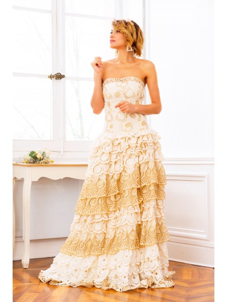 A désirer sous le soleil tropical ! Elégante robe créole en broderie avec son bustier au niveau du décolleté ; Accompagné d'une jolie cordelière dans le dos pour mettre en relief le charme particulier de la taille.