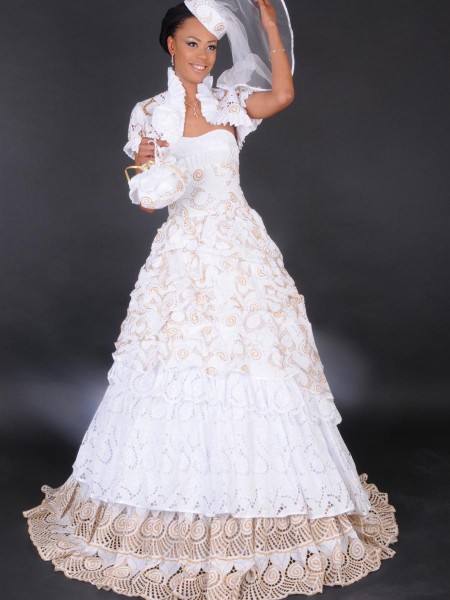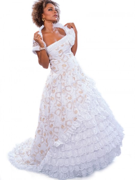 Robe de mariee style antillais avec un bustier en forme de coeur et bretelles