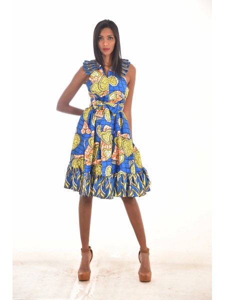 La robe Afrika en Wax mi longue destinée à vêtir la belle des îles, toujours de l'agréable collection de Dody. Son col arrondie avec un large volant est agrémenté et de différents coloris, laissant paraître la grâce des épaules. Une ceinture à nouer vient marquer la forme de la taille.