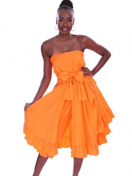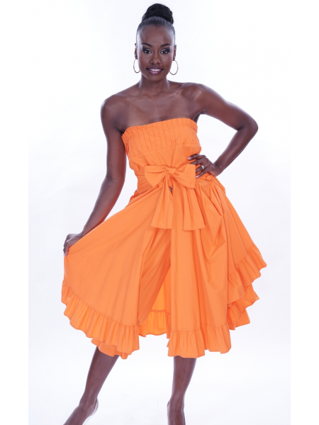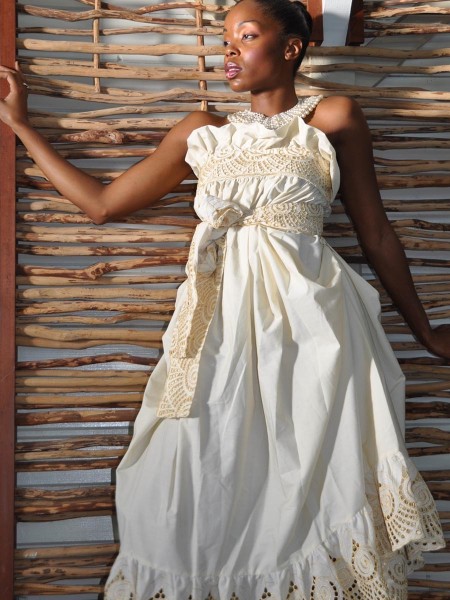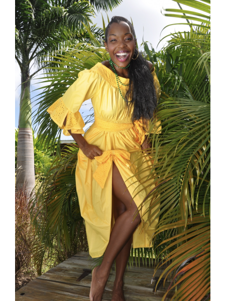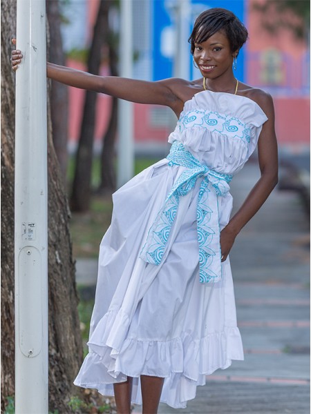Robe décolletée réalisée en coton uni, la broderie creole vient à trois reprises souligner le haut, la ceinture nouée à la taille et le bas en léger volant froncé.